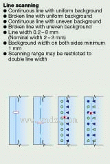 线扫描 均匀背景下的持续线条 均匀背景下的非持续线条 非均匀背景下的持续线条 非均匀背景下的非持续线条 线宽0.2-8毫米 (名义宽度2-3毫米) 两边背景最低宽度1毫米 扫描范围可能受双线宽度限制