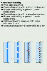 反射光在一个内置的三原色估价CCD芯片上被逐一进行象素扫描,然后被一个相连的处理器估价并把实际位置估价结果输出到CAN 总线。线上的断折和色彩的对比度不会导致工作中断。如果没有设置的特征出现,FE50不会输出实际位置估价。一个自动嚗光控制器不停地监控镜头扫描到的污渍并把这些污渍信息反馈给控制器。传感器在+/-10mm的测量范围内测定出精确到0.05mm的边缘位置。象印刷标志和标识语也许会在一个特殊的扫描区域被空白出来。这种纠偏探头被通俗的称为线扫描探头或对比度扫描探头。通用型号为FE5002和FE5102。